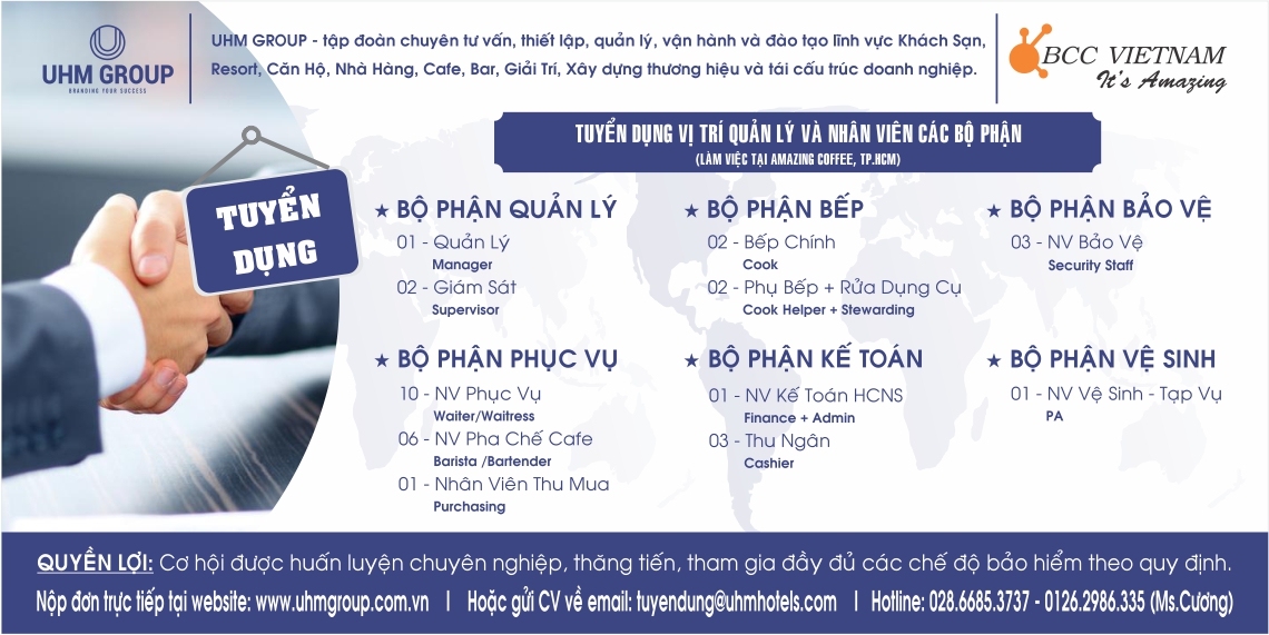 Tuyển dụng nhân sự cho dự án AMAZING Coffee tại thành phố Hồ Chí Minh 28/03/2018 uhmhotels.com UHM GROUP - Tập đoàn chuyên tư vấn và setup tuyển dụng các vị trí quản lý và nhân viên cho AMAZING Coffee tại Tp Hồ Chí Minh. Xem thêm